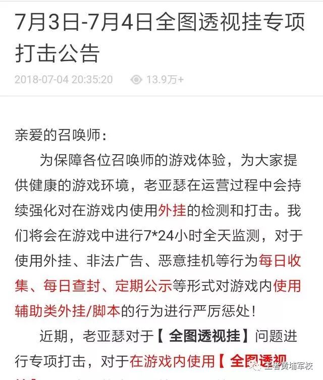 和往常一样 ,透视我每天都会关注王者荣耀的挂专告无资讯和公告。 今天再次看到7月3日至7月4日对全图透视衣架进行专项打击的项打公告。